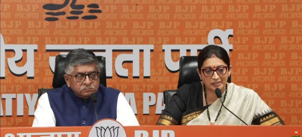 नई दिल्ली: भारतीय जनता पार्टी के नेता और पूर्व केंद्री मंत्री रवि शंकर प्रसाद और पूर्व केंद्रीय मंत्री स्मृति ईरानी ने भाजपा मुख्यालय में प्रेस कांफ्रेंस की। दोनों नेताओं ने सदन में महिला आरक्षण संशोधन विधेयक का समर्थन न करने पर कांग्रेस और विपक्ष पर जमकर हमला बोला।