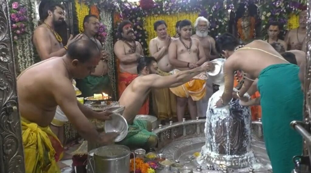 उज्जैन: रक्षाबंधन के महापर्व पर उज्जैन के महाकाल मंदिर में विशेष भस्म आरती हुई है। इस अवसर पर सवा लाख लड्डुओं का भोग लगाया गया। पुजारी परिवार की महिलाओं ने भगवान महाकाल को राखी बांधी, वहीं बड़ी संख्या में श्रद्धालु भस्म आरती दर्शन करने पहुंचे। प्रसिद्ध टीवी कलाकार अर्जुन बिजलानी भी भस्म आरती में शामिल हुए और बाबा महाकाल के दर्शन किए। भगवान महाकाल का पंचाभिषेक, श्रृंगार और भस्म आरती का भव्य आयोजन किया गया, जिसमें भगवान ने मन महेश स्वरूप में भक्तों को दर्शन दिए। पंडित अमर पुजारी ने कहा कि रक्षाबंधन का महापर्व है। मंत्रोच्चारण के साथ भस्म चढ़ाई गई, श्रंगार पूजन किया गया और फिर विधिवत रूप से आरती की गई। यहां भगवान महाकालेश्वर को राखी बांधी गई। अमर पुजारी ने कहा कि इस भस्म आरती के दौरान देश की सुख-समृद्धि और भाई-बहन के पावन पर्व पर देश में शांति की कामना की गई। गुजरात, महाराष्ट्र और अन्य राज्यों से भी भक्तधाम पहुंचकर इस शुभ आयोजन में शामिल हुए। टीवी कलाकार अर्जुन बिजलानी ने बताया कि वे पहली बार उज्जैन आए हैं और यह दिन उनके लिए बेहद खास है। अर्जुन ने कहा, “यह सावन का आखिरी दिन है, रक्षाबंधन के त्योहार के साथ-साथ पूर्णिमा का भी दिन है। भोपाल में शूटिंग खत्म होने के बाद बाबा महाकाल का आशीर्वाद लेकर मैं सीधे उज्जैन पहुंचा। भस्म आरती के बाद महाकाल के दर्शन कर मैं धन्य महसूस कर रहा हूं।” अर्जुन बिजलानी ने लोगों से अपील की कि सभी को कम से कम एक बार उज्जैन में बाबा महाकाल के दर्शन जरूर करने चाहिए। महाकाल के दर्शन करने के बाद महिलाओं ने कहा कि मंदिर में आकर बहुत अच्छा अनुभव रहा है। महिलाओं ने रक्षाबंधन के मौके पर कहा कि हर भाई को अपने बहनों के साथ-साथ दूसरी महिलाओं की भी रक्षा करनी चाहिए, यही अपील है।
