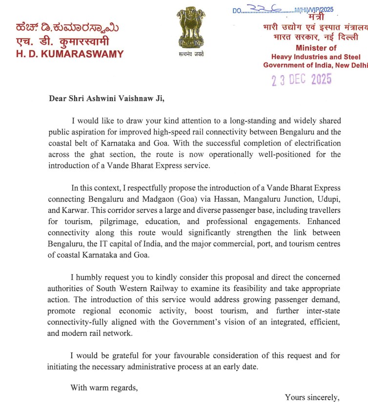 बेंगलुरु: केंद्रीय भारी उद्योग एवं इस्पात मंत्री एच.डी. कुमारस्वामी ने बेंगलुरु और गोवा के बीच हाईस्पीड रेल कनेक्टिविटी की मांग की ओर केंद्रीय रेल मंत्री को एक पत्र लिखा है। उन्होंने हसन, मंगलुरु जंक्शन, उडुपी और कारवार होते हुए बेंगलुरु से मडगांव (गोवा) तक वंदे भारत एक्सप्रेस ट्रेन शुरू करने का प्रस्ताव रखा है। कुमारस्वामी ने पत्र में कहा कि घाट सेक्शन में विद्युतीकरण का काम सफलतापूर्वक पूरा हो चुका है, जिसके बाद यह मार्ग अब वंदे भारत एक्सप्रेस चलाने के लिए पूरी तरह तैयार है। यह ट्रेन पर्यटन, तीर्थयात्रा, शिक्षा और नौकरी संबंधी यात्रा करने वाले लाखों लोगों की सुविधा बढ़ाएगी। इससे भारत की आईटी राजधानी बेंगलुरु और तटीय कर्नाटक तथा गोवा के प्रमुख व्यापारिक, बंदरगाह तथा पर्यटन केंद्रों के बीच संबंध और मजबूत होंगे। केंद्रीय मंत्री ने जोर देकर कहा कि इस रूट पर बेहतर रेल कनेक्टिविटी से क्षेत्रीय अर्थव्यवस्था को बल मिलेगा, पर्यटन को बढ़ावा मिलेगा और अंतर-राज्यीय संपर्क और मजबूत होगा। यह प्रस्ताव केंद्र सरकार के एकीकृत, कुशल और आधुनिक रेल नेटवर्क बनाने के विजन से पूरी तरह मेल खाता है। कुमारस्वामी ने रेल मंत्री से विनम्र अनुरोध किया है कि वे इस प्रस्ताव पर गंभीरता से विचार करें और दक्षिण पश्चिम रेलवे के अधिकारियों को इसकी व्यवहार्यता जांचने तथा जरूरी कदम उठाने के निर्देश दें। उन्होंने उम्मीद जताई कि इस अनुरोध पर जल्द सकारात्मक कार्रवाई होगी, जिससे बढ़ती यात्री मांग पूरी हो सकेगी। कर्नाटक और गोवा के तटीय क्षेत्रों के लोग लंबे समय से इस मार्ग पर तेज रफ्तार ट्रेन की मांग कर रहे हैं। वंदे भारत एक्सप्रेस की शुरुआत से यात्रा का समय काफी कम होगा और दोनों राज्यों के बीच आवागमन आसान बनेगा। यह कदम क्षेत्र के विकास में महत्वपूर्ण योगदान देगा और यात्रियों को विश्वस्तरीय सुविधा उपलब्ध कराएगा।