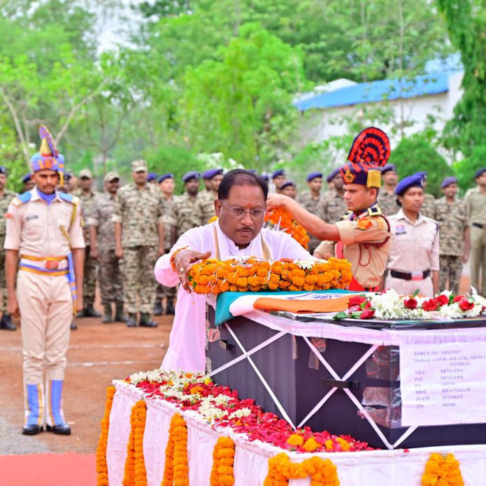 रायपुर, छत्तीसगढ़ के मुख्यमंत्री विष्णु देव साय और उपमुख्यमंत्री विजय शर्मा ने नारायणपुर के अबूझमाड़ वन क्षेत्र में नक्सलियों के साथ मुठभेड़ में शहीद हुए कोबरा बटालियन के जवान सोलंकी मेहुल भाई को श्रद्धांजलि दी। दोनों नेताओं ने 21 मई को शहीद हुए सोलंकी के पार्थिव शरीर को कंधा देकर उनकी वीरता और बलिदान को नमन किया। यह मुठभेड़ बीजापुर के उसूर क्षेत्र में माओवाद विरोधी अभियान के दौरान हुई थी। मुख्यमंत्री साय ने कहा, “22 मई को बीजापुर में गुजरात के निवासी सोलंकी मेहुल भाई ने माओवादियों के खिलाफ मुकाबले में अदम्य साहस का परिचय देते हुए वीरगति प्राप्त की। हम उनकी शहादत को नमन करते हैं। भगवान से प्रार्थना है कि उनकी आत्मा को शांति प्रदान करें। मेहुल सोलंकी की शहादत व्यर्थ नहीं जाएगी। आने वाले दिनों में बस्तर क्षेत्र में शांति स्थापित होगी।” उन्होंने आगे कहा कि पिछले डेढ़ साल से सुरक्षा बल नक्सलवाद के खिलाफ मजबूती से लड़ रहे हैं और लगातार अभियानों में सफलता हासिल कर रहे हैं। 31 मार्च 2026 तक पूरे देश से नक्सलवाद को समाप्त करने का संकल्प पूरा होगा। उपमुख्यमंत्री विजय शर्मा ने भी शहीद सोलंकी मेहुल भाई को श्रद्धांजलि अर्पित की और कहा कि उनकी वीरता और बलिदान छत्तीसगढ़ के लोगों के लिए प्रेरणा है। हमारे जवान नक्सलवाद के खिलाफ निर्णायक लड़ाई लड़ रहे हैं। यह बलिदान हमें और मजबूती से इस चुनौती का सामना करने के लिए प्रेरित करता है। छत्तीसगढ़ के सुकमा जिले के तुमरेल गांव के जंगल क्षेत्र में गुरुवार को माओवादियों और सुरक्षा बलों के बीच हुई भीषण मुठभेड़ में केंद्रीय रिजर्व पुलिस बल (सीआरपीएफ) की कोबरा बटालियन के एक कमांडो शहीद हो गए थे, जबकि एक माओवादी मारा गया। इस मुठभेड़ में दो अन्य कोबरा कमांडो भी घायल हुए हैं। मुठभेड़ उस समय शुरू हुई, जब माओवादियों की मौजूदगी की खुफिया जानकारी के आधार पर सुरक्षा बलों ने अभियान शुरू किया था। यह मुठभेड़ एक दिन पहले नारायणपुर-बीजापुर सीमा पर हुई बड़ी कार्रवाई के बाद हुई, जिसमें 27 माओवादी मारे गए थे, जिनमें सीपीआई (माओवादी) का महासचिव नंबाला केशव राव उर्फ बसवराजू भी शामिल था।