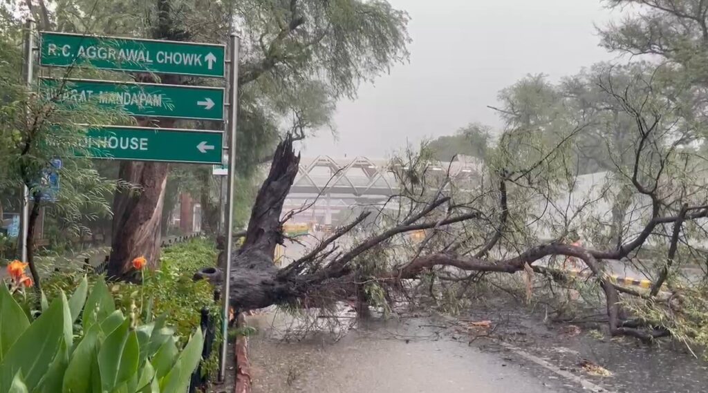 नई दिल्ली, दिल्ली और आसपास के इलाकों में मौसम ने रविवार को अचानक करवट ली। दिल्ली-एनसीआर के कई इलाकों में रविवार को धूल भरी आंधी के बाद बारिश हुई, जिससे मौसम सुहावना हो गया और लोगों को गर्मी से राहत मिली। दिल्ली और गाजियाबाद, नोएडा, गुरुग्राम तथा फरीदाबाद जैसे आसपास के शहरों के कई निवासियों ने रविवार को सोशल मीडिया पर तेज धूल भरी आंधी की तस्वीरें साझा की। वीडियो में तेज हवाओं के साथ पेड़ हिलते हुए दिखाई दे रहे हैं। दिल्ली-एनसीआर के कुछ हिस्सों में मौसम विभाग ने ऑरेंज अलर्ट जारी किया, जिसमें आंधी, बिजली और तेज हवाओं के साथ बारिश की चेतावनी दी गई। मौसम विभाग के अनुसार “अगले 2 घंटों के दौरान पूरे दिल्ली, एनसीआर (नोएडा, ग्रेटर नोएडा, गुरुग्राम, फरीदाबाद, मानेसर, बल्लभगढ़) में धूल भरी आंधी/उसके बाद हल्की बारिश और बिजली गिरने की संभावना है।” भारतीय मौसम विभाग (आईएमडी) के अनुसार, रविवार को राष्ट्रीय राजधानी का न्यूनतम तापमान 27.2 डिग्री सेल्सियस दर्ज किया गया, जो मौसम के औसत से 0.3 डिग्री अधिक है। आईएमडी ने दिन में आंशिक रूप से बादल छाए रहने और गरज के साथ छींटे पड़ने की संभावना जताई थी। अधिकतम तापमान 37.9 डिग्री सेल्सियस दर्ज किया गया। सापेक्षिक आर्द्रता 51 से 56 प्रतिशत के बीच दर्ज की गई। केंद्रीय प्रदूषण नियंत्रण बोर्ड (सीपीसीबी) के आंकड़ों के अनुसार रविवार सुबह 9 बजे वायु गुणवत्ता सूचकांक (एक्यूआई) 198 के साथ “मध्यम” श्रेणी में दर्ज किया गया। इससे पहले शनिवार शाम को भी दिल्ली-एनसीआर में धूल भरी आंधी चली, जिससे दृश्यता कम हो गई और क्षेत्र के कई हिस्सों में तेज हवाएं चलीं। सोशल मीडिया पर कई यूजर्स ने नोएडा, ग्रेटर नोएडा, नई दिल्ली और एनसीआर क्षेत्र के अन्य हिस्सों से धूल भरी आंधी के वीडियो शेयर किए थे। नोएडा और दिल्ली क्षेत्र में शनिवार शाम को भी हल्की बारिश हुई, जिससे लोगों को बढ़ते तापमान और गर्मी के बीच राहत मिली।